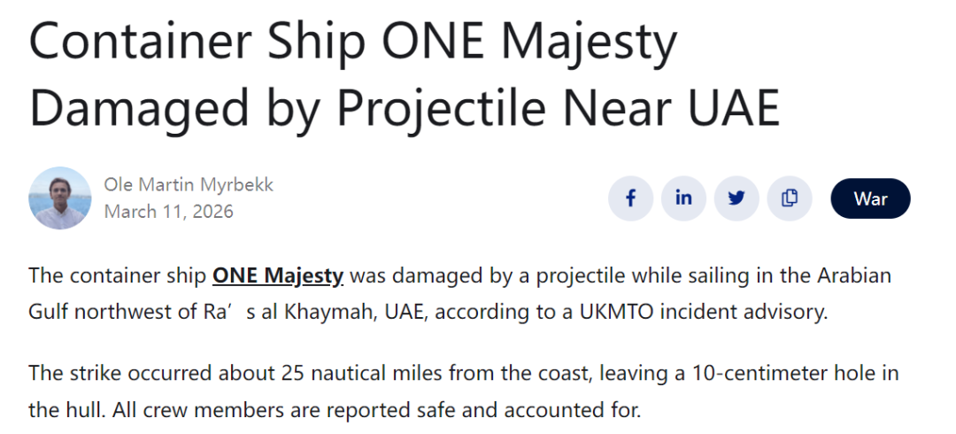据英国《金融时报》11日援引海事机构及航运公司消息,日本海运巨头商船三井旗下集装箱船“ONE MAJESTY”在波斯湾航行期间遭遇袭击。